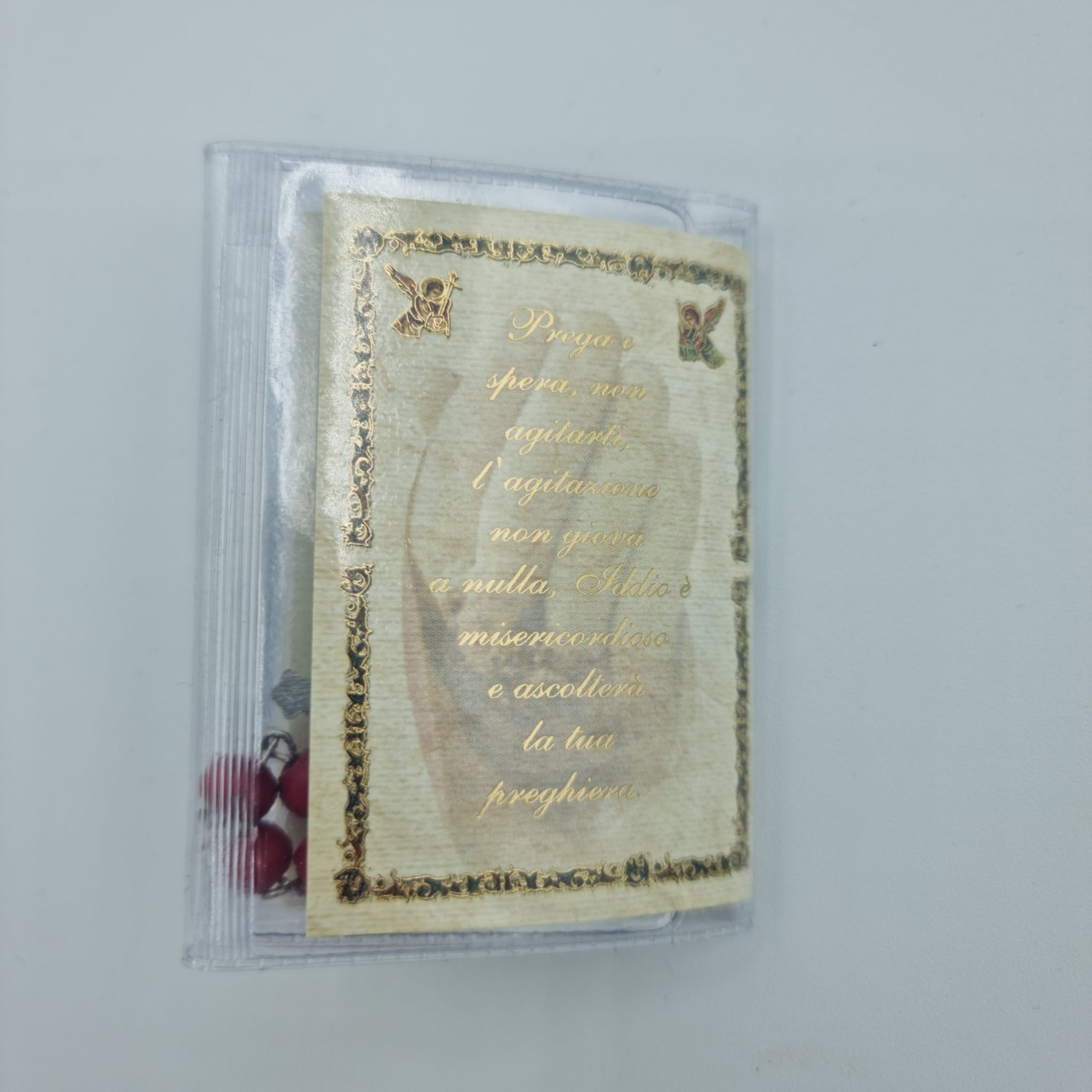 Decina di legno colore rosso e profumato per immersione. Grandi tondi e lisci con legatura in metallo argentato. Medaglia con immagine a rilievo raffigurante San Pio e, sul retro, immagine della Madonna delle Grazie. Crocifisso in metallo argentato.